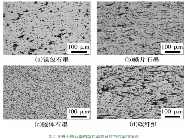 含不同石墨類型鎳基復合材料的金相組織形貌如圖2所示,由圖可知:膠體石墨分布最均勻,鱗片石墨和鎳包石墨次之,碳纖維的混合均勻程度最差。碳纖維由有機纖維經(jīng)碳化及石墨化處理得到,團聚較嚴重,采用三維混合方法難以均勻,因此制得的復合材料中碳纖維分布不均勻。