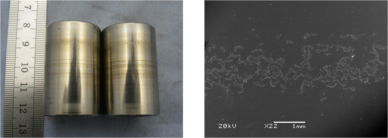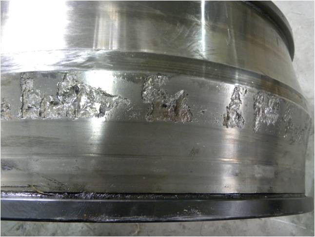 當(dāng)電流通過滾動(dòng)體和潤(rùn)滑油膜從軸承的一個(gè)套圈傳遞到另一套圈時(shí),由于絕緣不適當(dāng)或絕緣不良,在接觸區(qū)內(nèi)會(huì)發(fā)生擊穿放電。在套圈和滾動(dòng)體之間的接觸區(qū),電流強(qiáng)度增大,造成在非常短的時(shí)間間隔內(nèi)局部受熱,使接觸區(qū)發(fā)生熔化并焊合在一起。