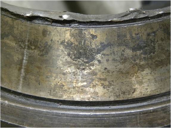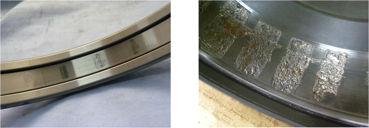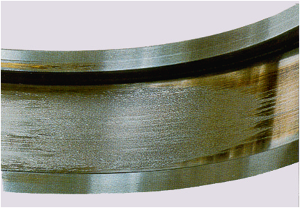 涂抹:由于滾動(dòng)體承載較輕并且在其反復(fù)進(jìn)入承載區(qū)時(shí),受到強(qiáng)烈的加速作用,因此,在滾動(dòng)體和滾道之間會(huì)發(fā)生涂抹(滑傷);當(dāng)載荷相對(duì)于轉(zhuǎn)速過小時(shí),滾動(dòng)體和滾道之間也會(huì)發(fā)生涂抹,這樣的涂抹也稱之為“輕載打滑”。打滑嚴(yán)重的情況下滾道表面會(huì)出現(xiàn)高溫變色痕跡。