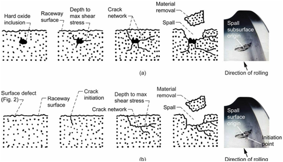 不對(duì)中或偏載。軸撓曲后,內(nèi)圈相對(duì)于外圈傾斜導(dǎo)致滾道邊緣承載,在滾道邊緣與油溝處形成剝落并向滾道中部擴(kuò)展。