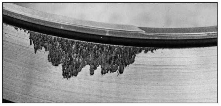 當(dāng)潤(rùn)滑劑中的水分或劣化的潤(rùn)滑劑與其相鄰的軸承零件表面發(fā)生反應(yīng)時(shí),可在滾動(dòng)體和軸承套圈之間的接觸區(qū)內(nèi)發(fā)現(xiàn)一種特定形式的銹蝕,在深度銹蝕階段,接觸區(qū)在對(duì)應(yīng)于球或滾子節(jié)距的位置將會(huì)變黑,最終產(chǎn)生腐蝕麻點(diǎn)。